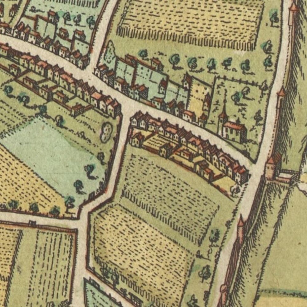 Before the 17th century, the road leading to the new and outer city gate of 15th century Tiensepoort from the first and old 12th century city gate of Sint-Michielspoort was known as the ‘Hoelstrate‘. When this new gate was built, it was simply called the ‘Hoelstrate-Buiten-Poorte‘ (Holestreet Outer Gate).